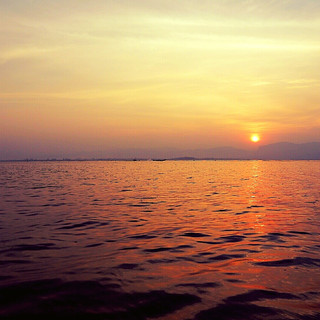 A 17h, on a beaucoup trop bu et mangé. Ma foi, on est restés polis, on a fini nos assiettes et encore, on a quand même refusé la deuxième tournée de riz! Notre chauffeur nous propose d'y aller, pour arriver à temps pour le coucher du soleil. On fait nos adieux à cette famille qui nous a accueilli si chaleureusement chez eux. Partir les mains vides ? Non, c'est pas dans la coutume des birmans! On a le droit à un gros sac de bananes et un autre de tomates du jardin flottant. De mon côté, j'ai aussi le droit à un maquillage au thanaka, fraîchement dissous par la femme du chauffeur. Les femmes rigolent: une européenne qui se met du thanaka, dans leur maison!