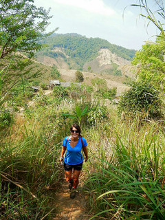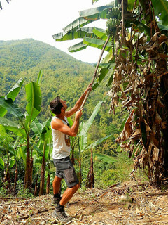 Le matin, on fait le plein de fruits frais que la Thaïlande a à offrir: bananes, mangues thaï, ananas, fruit du dragon... Et on s'aventure dans la jungle pour un trek en duo direction la cascade. A Chiang Rai, c'est super simple de partir marcher sans guide, tant qu'on s'aventure pas trop loin. Notre journée est bien remplie: marche dans la jungle, baignade dans la piscine naturelle de la cascade, pique-nique au bord d'une petite rivière avec nos sandwichs faits avec amour et soigneusement emballés dans une feuille de bananier, traversée des plantations de thé et des villages ethniques... Notre marche touche à sa fin, on est bientôt de retour au Bamboo Nest. Dernier arrêt aux sources chaudes naturelles. L'entrée coûte seulement 2.- par personne pour un bain privé, un peu comme un jacuzzi. L'eau chauffée par le souffre sort à environ 90 degrés, on la mélange avec de l'eau glacée. Dehors, les thaïs font cuire des œufs dans l'eau bouillante... Avant de terminer notre journée, Nelson joue à Koh Lanta en attrapant des bananes tout en haut d'un bananier avec un morceau de bambou et son couteau suisse. Journée bien remplie, paysages magnifiques et relaxants!