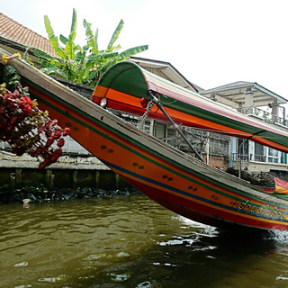 Prochaine étape, on se rend au port où on monte dans un petit bateau pour descendre quelques arrêts plus loin. Là, on veut monter dans ces longues barques pour faire un tour sur les célèbres Klongs de Bangkok, mais il ne nous reste plus beaucoup de temps. Le planning est serré, on doit être à l'hôtel dans une heure avant d'aller jusqu'à la gare pour prendre le train pour Koh Samui. Un départ sur les îles, on veut pas manquer ça. Mais, on tente le coup. La ballade dure 1h, juste le temps à notre disposition. Mais... Le prix, 600 baht chacun (plus que 15.-!). En nous voyant discuter, le vendeur baisse son prix, mais c'est toujours trop. Finalement, après un peu d'acharnement on réussi à descendre le prix à 250 chacun. Gagné! On fonce dans le bateau qui a déjà du retard... La ballade est sympa, on voit un autre aspect de Bangkok à travers ces petites maisons suspendues au bord du fleuve, comme une Venise thaïlandaise. Jusqu'à ce qu'il se mette à pleuvoir des cordes! La course commence: on rentre au port en retard, complètement trempés, c'est la grosse averse. Vite, on appelle un Uber qui nous amène à l'hôtel, on récupère nos sacs et direction la gare. C'est qu'une dizaine de minutes plus tard qu'on se rend compte qu'on a pas les billets!! Panique générale!! Rien dans les sacs. J'appelle l'hôtel pour demander s'ils sont là bas, mais ils me disent que non... Le Uber fait demi-tour. En plus, on est tombé sur un chauffeur qui ne parle pas un mot d'anglais. Nelson court dans le dortoir et s'aperçoit que les billets y étaient restés, mais avaient glissés dans le troisième casier du dessous! On est tous super stressés, notre train part dans 30 minutes et la gare est encore loin. Pas sûre que notre chauffeur comprenne tout, mais il fait en sorte d'aller vite et nous dépose à la gare 4 minutes avant le départ du train. Sprint final. On aura eu chaud, mais on l'a, victoire!