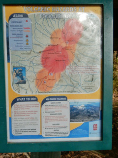Tongariro Alpine Crossing On l'attendait avec impatience depuis notre arrivée en Nouvelle-Zélande, c'est une des plus connues du pays, c'est la randonnée "Tongariro Alpine Crossing"! Elle fait partie des Great walks du département de la conversation, mais peut se faire en une seule journée si on est motivés. La randonnée traverse un terrain volcanique et contourne deux monts, le Tongariro et le Ngauruhoe, qui culminent à 1960m et 2280m. Sur le chemin, des cratères, des lacs, de la vapeur et des sources chaudes. Ce matin, en partant du camping de bonne heure, nos sacs étaient remplis de barres énergétiques, de kiwis et quelques tranches de pain pour faire des sandwichs. La veille, on s'est renseignés au centre des visiteurs du parc et en cette période de l'année, à cause de la neige, il n'est pas recommandé de faire le trek seul et en entier, sans matériel adapté: casque, piolet... Donc vers 9h, on arrive au parking au nord de la marche, sur le point Ketetahi et on est prêts à aller le plus loin possible. Le sentier commence par des mises en garde et des panneaux explicatifs. On va quand même marcher sur un volcan, il y a certains dangers à prendre en compte, et en plus avec la neige il y a des risques d'avalanche.
