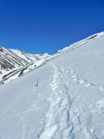 Notre but est d'atteindre le lac émeraude, d'un bleu apparemment irréel, qu'on ne peut voir qu'en escaladant le volcan puisqu'il est caché entre des cratères. La marche continue, on monte de plus belle pendant 1h, mais les passages enneigés sont de plus en plus fréquents. Pour l'instant rien de dangereux, mais petit à petit le sentier est entièrement recouvert de neige et la pente est raide. Un groupe de randonneurs équipés et avec un guide croise notre chemin en sens inverse, ils arrivent sur la fin de la marche. Le guide ne nous recommande pas de passer par là sans piolet, et pour nous consoler, il nous montre une photo du lac émeraude, qui entièrement gelé et recouvert de neige, ne ressemble qu'à une grosse tâche blanche.