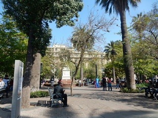 On continue notre promenade le long des murs taggués et des bars branchés pour ensuite traverser un grand parc où les habitants viennent promener leur chien et discuter sur l'herbe. Santiago propose une quantité folle de musées à visiter, mais manque de bol, aujourd'hui dimanche, rien est ouvert! On passe devant le beau musée d'art un peu déçus, puis la place d'Armes, le palais de la monnaie et enfin le marché central. Le Lonely Planet nous promettait des petits stands de rue pas chers, mais tout ce que nous trouvons ce sont des étals de poissons qui puent. :-)