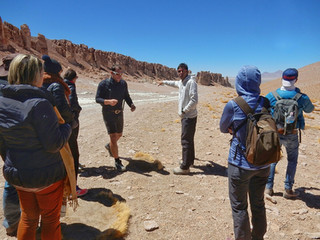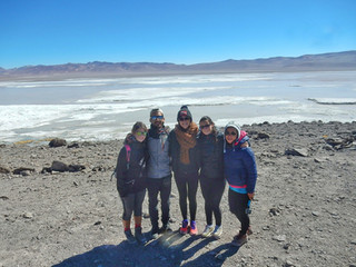 Les voyageurs venus à San Pedro de Atacama ne sont certainement pas là pour se reposer. Ici, c'est le hub des excursions dans le désert d'Atacama et tous les merveilleux paysages d'altitude. On passerait bien une journée tranquillement allongés dans un hamac, mais le soleil cogne vraiment fort, alors aujourd'hui pas de repos pour les guerriers, c'est à quelques pas de l'Argentine qu'on nous conduit! Le salar de Tara Tôt ce matin, on attend le mini-bus de la journée pour cette expédition. Tim, un Belge qui se débrouille très bien en espagnol, est notre guide pour le salar. Dans notre groupe, 2 couples Brésiliens, 1 couple suisse-allemand, Kevin de Sydney et enfin trois copines françaises en vacances, Nawel, Livia et Kelly. Notre team s'annonce beaucoup plus fun que le groupe de l'autre jour! On fait tous connaissance autour d'un bon petit-déjeuner préparé par Tim, avec pour vue le somptueux volcan Licancabur qui culmine à 5900 mètres d'altitude et qui fait frontière entre la Bolivie et le Chili. Après ce festin, pains au chocolat, baguette et salami, mate de coca en prévision de l'altitude, on repart tous à bord direction l'entrée officielle du salar. Tim fait un petit crochet sur la route pour nous montrer une de ses lagunes préférées. On emprunte une route toute caillouteuse, on est en mode 4x4 dans un minibus plutôt pourri, c'est pas le top. Mais arrivé à la lagune, ça en valait la peine! Il n'y a que nous pour admirer ce paysage, observer de loin les flamands et comprendre que les gros blocs blancs sur l'eau ne sont pas de glace, mais de sel!