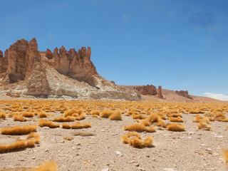 On entame une petite marche dans un décor désertique, où des pics volcaniques parsèment l'immensité autour de nous. Ils datent d'une éruption volcanique lors de laquelle des pierres se sont fait expulsées du cratère et jetées à des kilomètres de là. L'érosion permanente a ensuite creusé et sculpté ces roches qu'on nomme monjes (moines). Ca pourrait être digne d'un décor de Far West! Bien que les 4300 mètres d'altitude rendrait un peu difficile un tournage dans ce coin... Tim nous emmène ensuite vers les fameuses cathédrales, creusées selon le même principe d'érosion et formant une barrière géante qui "protège" le lac salé du salar. Une petite heure de marche, ça peut pas faire de mal en plus en descente, mais on est pas encore hyper acclimatés et le mal de tête commence à se faire sentir, plus la respiration courte dès le moindre effort.