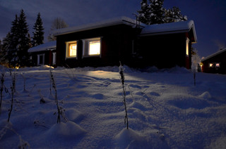 Les chalets sont souvent construits en rondins, donnant l'apparence d'une petite maison en bois, qui se marie très bien avec le paysage entièrement blanc, mais il y a aussi les maisons nordiques colorées: rouges, bleues, jaunes... Lorsque la nuit est tombée, donc à partir de 15h environ jusqu'à 10h le lendemain matin, les chalets s'illuminent, laissant entrevoir de petites fenêtres éclairées, des chandeliers, des guirlandes de Noël sur les sapins, des lanternes dans le jardin ou encore des étoiles en papier illuminées comme des lampions derrière les fenêtres. Le style scandinave! Souvent, les maisons comportent un deuxième étage en mezzanine, avec une toute petite fenêtre, de laquelle descend une échelle directement vers le sol. Peut-être pour faciliter l'accès à la cheminée au père-noël? :-) Enfin, toutes les maisons finlandaises sont équipées de... tadaaaa... un sauna! Un beau sauna en bois, typique, typique, typique, avec une louche pour verser l'eau sur les pierres chaudes, un thermomètre et un sablier. Tradition finlandaise oblige, après une bonne journée passée à -20 voire -30 degrés (ou pire) dehors, rien de tel que de se réchauffer dans un sauna à 90 degrés!