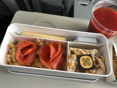 Cet hiver, la compagnie Swiss a inauguré son tout premier vol Genève - Kittilä sans escale! Quoi de plus pratique? Tôt ce matin, les valises remplies d'habits chauds, on fait la queue pour embarquer à bord du Bombardier Swiss qui nous emmènera en 3h45 au-dessus du cercle arctique. En vol, petite assiette froide de salade de pommes de terre, saumon à l'aneth et gâteau aux myrtilles en dessert. De quoi nous mettre gustativement dans l'ambiance. A 15h heure locale, (+1h de décalage par rapport à la Suisse) l'avion atteri sur le tarmac enneigé de Kittilä. Mode skis activé! Il fait déjà nuit, le soleil s'est couché. Même si on apprendra plus tard qu'en cette période, le soleil ne dépasse même pas l'horizon!