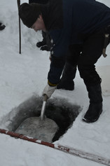 Les motoneiges s'alignent au bord du lac gelé de Luosu. Trois petites maisons à l'horizon. Une pause s'impose dans un petit café totalement perdu, qui nous offre du jus de baies bien chaud et une pâtisserie finlandaise, qu'on pourrait comparer à un beignet au sucre, ou une boule de berlin sans confiture. L'estomac bien rempli et réchauffé, on écoute maintenant les explications du maître Fisherman qui nous montre comment pêcher sous la glace à la finlandaise, avec un ustensile un peu compliqué à comprendre qui sert de filet de pêche. La couche de glace est de 35cm ce matin!