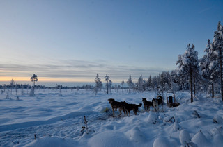 On prépare les chiens, il faut leur passer le harnais et les attacher au traineau. Quatre chiens chacune pour nous et six pour Juho, étant donné qu'il a plus de choses à tirer dans son traineau. Les huskies sont en place et nous aussi, on a les pieds enfoncés sur les freins. Pas question de bouger d'un centimètre une fois le traineau détaché sinon les chiens partiraient à fond à travers la forêt. Ils ont tellement hâte de partir courir! Juho démarre le premier, suivi de Céline, Maria, et moi en dernier. Je me cramponne tellement fort, les chiens tirent comme pas possible mais faut que je laisse un peu de distance devant moi. Allez, j'enlève mes pieds et c'est partiiiiiiiii... en trois secondes, les aboiements se sont tus, il n'y a que le doux bruit des pattes des huskies frôlant le sol glacé, le traineau qui glisse sur la neige et le reste n'est que silence.