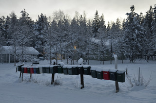 On traverse plusieurs lacs gelés (d'ailleurs, cette région en été doit être magnifique avec tous ces lacs) et des forêts de sapins enneigés. A 11h, la luminosité est quasi à son maximum, malgré le fait que le soleil ne pointe jamais le bout de son nez. A ces latitudes, de début décembre à début janvier, le soleil ne dépasse en fait jamais l'horizon. Il éclaire suffisamment entre 10h et 15h pour que ce soit considéré comme "le jour", mais ses rayons (et surtout sa chaleur) ne sont pas visibles pendant tout un mois, ce qu'on appelle la nuit polaire. Au contraire, pendant le jour polaire, le soleil ne se couche jamais! Pendant les nuits polaires, le rythme de vie est plus lent, puisqu'on bénéficie de moins d'heures d'ensoleillement, on a donc l'impression que la journée se termine déjà en plein milieu de l'après-midi! C'est donc parfait pour un peu de repos ;-)